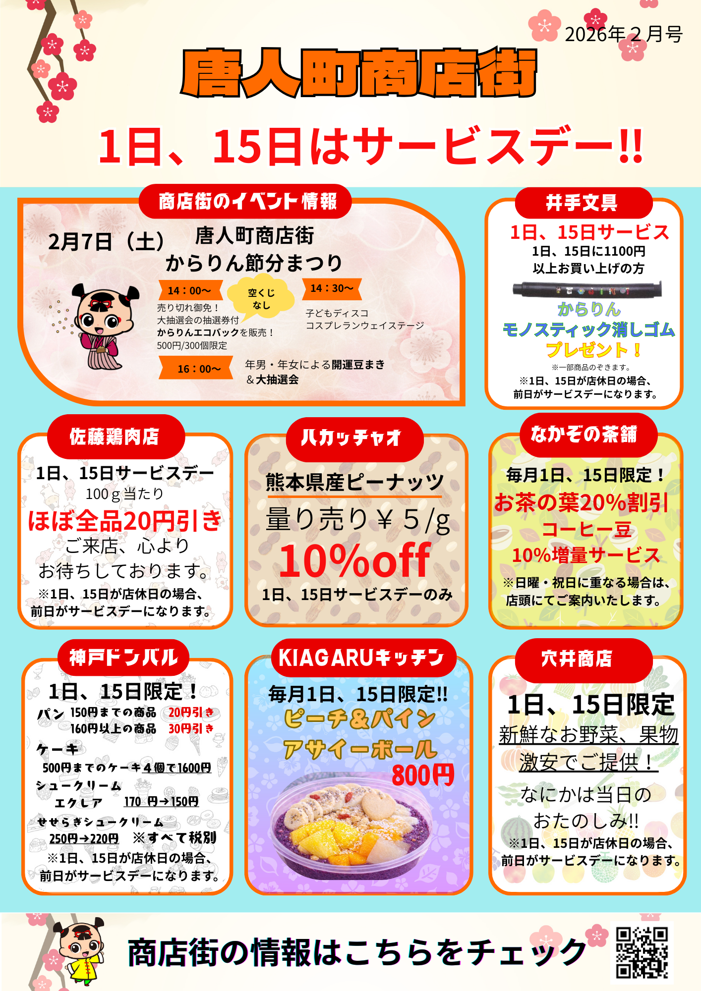 「節分まつり」についてのチラシと新しく「1日・15日のサービスデー」についての情報を公開しました。