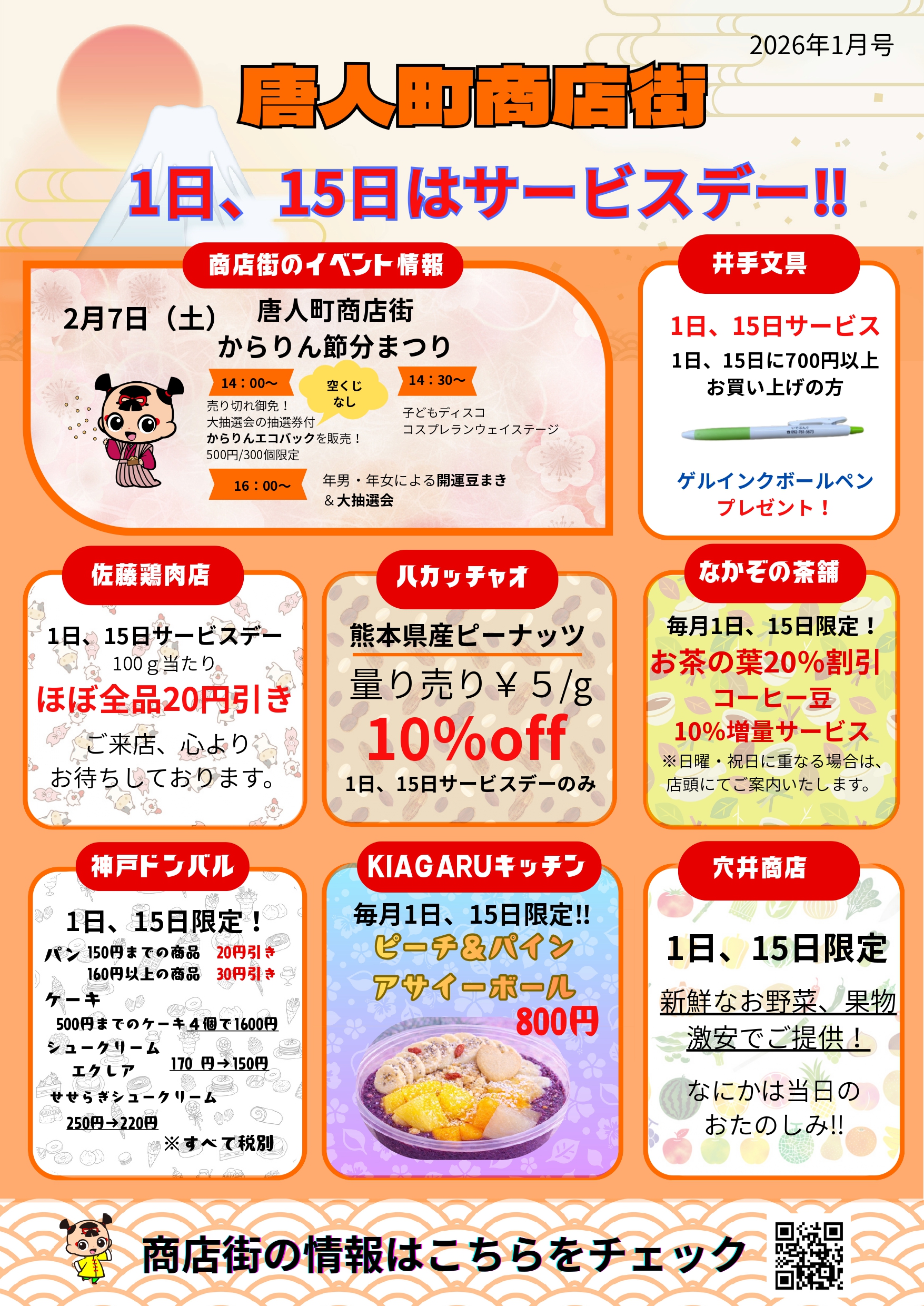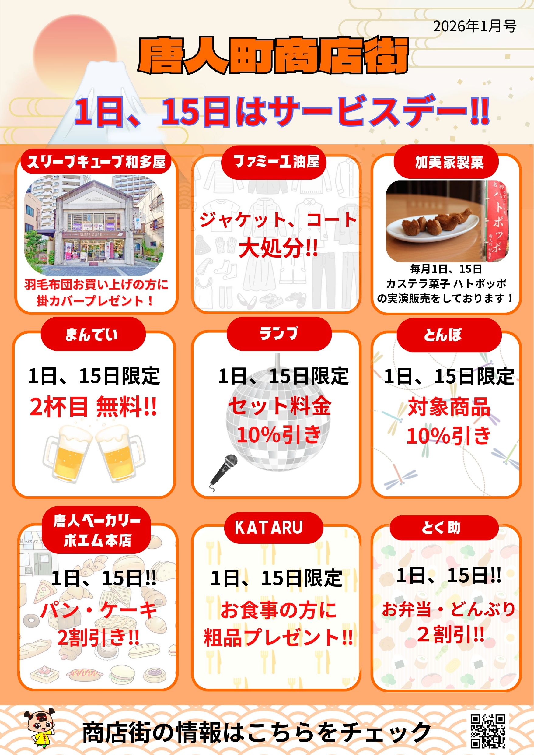 毎月1日・15日は、唐人町商店街の各店舗で「お買い得商品」が準備されており、早い者勝ち!